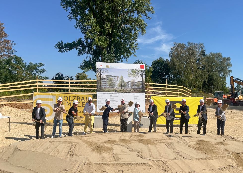 Work is also continuing on our site at the former Prinz Leopold Barracks! We broke ground here in August. In addition to the building contractors, planners and the press, Mayor Gertrud Maltz-Schwarzfischer and Minister of State Christian Bernreiter from the Bavarian State Ministry of Housing, Construction and Transport were also in attendance.