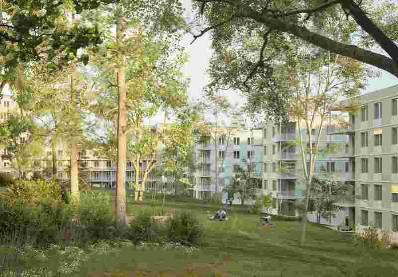 The building block on Mariabrunnstraße provides an address for the daycare centre and commercial or research uses. At the same time, the shape of the building shows the way into the neighbourhood and creates access points on both sides that lead to the entrances of the garden houses. Three similar buildings confidently mediate between the existing garden courtyard of the buildings on Weberstraße and the new green space being created to the south. This open spatial approach reinforces the character of living in the garden.
