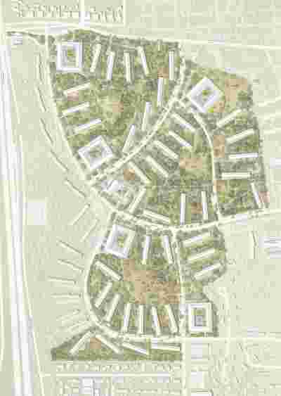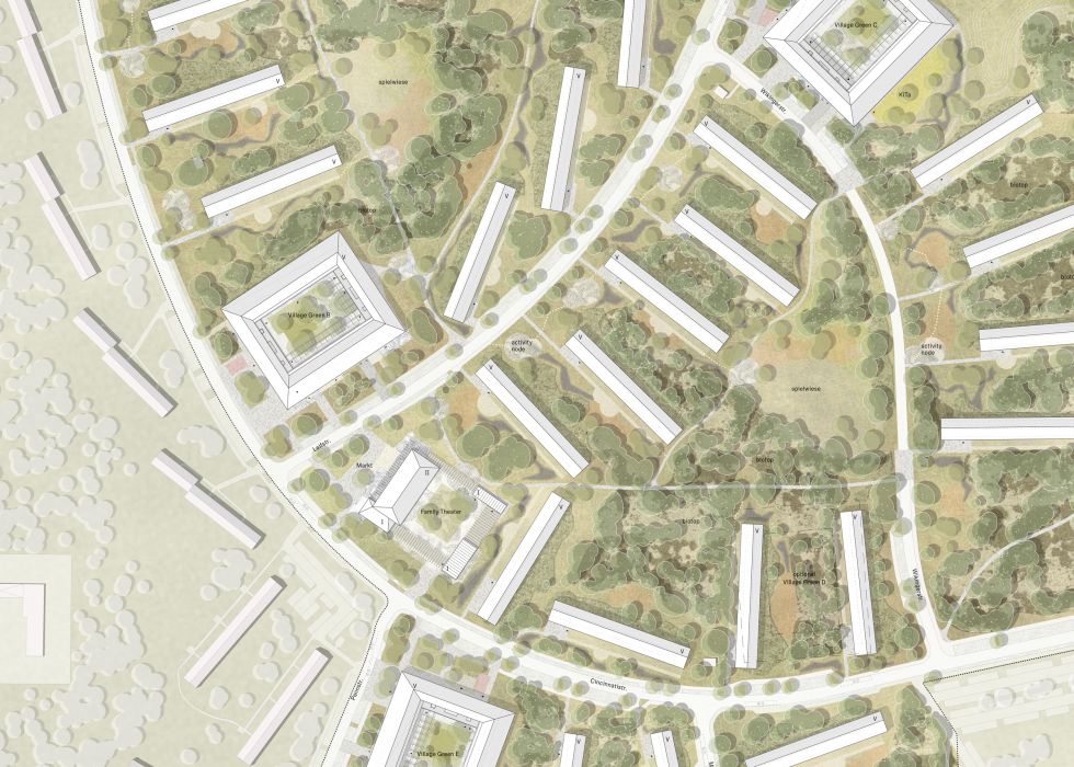Das Resultat der Überlegungen erfüllt alle Ansprüche an die Entwicklung der Siedlung. Es akzeptiert und entwickelt den Ort mit bekannten Typologien, hält den homogenen, verbindenden Horizont gleicher Traufen. Die Strategie ist in Phasen anwendbar. Bereits sanierte Gebäude bleiben während der Umbauphase selbstverständlich Teile der Siedlung. Bestehende Biotopflächen werden gestärkt und können sich weiterentwickeln. Bestehende Straßen bleiben stadträumlich weit dimensioniert, nehmen allerdings unterschiedliche Dichten an Verkehren auf, und werden so, bei gleichbleibender Breite, atmosphärisch differenziert als Fahrstraßen mit Busverkehr, Erschließungsstraße oder als Radstraße mit Anliegerfunktion wahrgenommen. Ergänzend stärkt der Entwurf ein bestehendes Wegenetz. Je nach Situation und Orientierung positionieren sich zwei neue Typen von Zeilen, „Balkony“ oder „Porch“. Erschließungswege der Zeilen bleiben erhalten. Sie dienen, frei von Rettungswegeansprüchen beispielsweise bei den Typen „Porch“ sowohl als Schnittstelle zu den Adressen der Häuser als auch als Übergangszone entlang der Terrassen der, teils als Maisonette vorgeschlagenen Erdgeschoßwohnungen. Ein lässig vertrautes, amerikanisches Motiv selbstverständlicher Nachbarschaft stellt sich ein. Das bestehende, denkmalgeschützte Gebäude des ehemaligen Kasinos wird als Zentrum der Siedlung akzeptiert und dafür freiräumlich ergänzt. Zusammen mit den neuen Typen der „Village Greens“ und deren öffentlichen Nutzungen wie KITA, kleinen Läden und Einheiten der Dienstleistung und des Arbeitens aber auch des Parkens im UG, ergibt sich also eine echte qualitative und quantitative Weiterentwicklung des kollektiven Lebens in vertrauter Atmosphäre und Nachbarschaft in den neuen Perlach Greens.