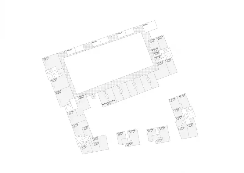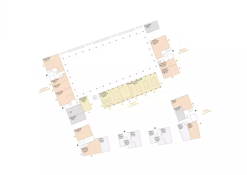 The houses are arranged according to different qualities and atmospheres of the urban space. The buildings surround the new quarter: townhouses alternate with courtyard houses, places of production with flats and roof gardens. One enters all the houses from the street. The flats are reached via a spacious two-storey hall. These halls form the entrance and spatially complement the two-storey "garden rooms" of the houses. A spatial interweaving of the house community is created. The ground floor is divided into two floors, allowing for a wide range of flat sizes.
