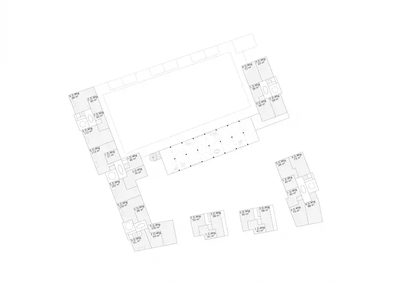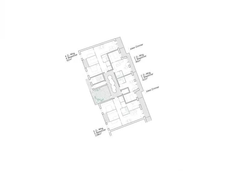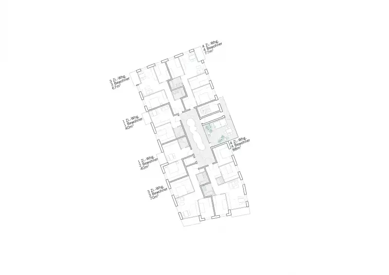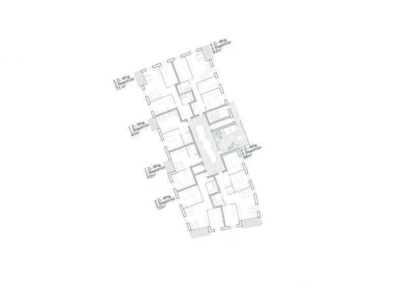 The term "together", which seems elementary to us for the self-image of wagnis, should continue to accompany us through the development of the concept. In this neighbourhood, the wagnis cooperative should and can be an important partner. The Gebosssen are the residents of an integrative building block that mediates in the neighbourhood as - an urban project of the many. A continuous (in)unity is being created. An arrangement of possibilities, of different qualities and locations is to characterise the urban space. These locations determine the neighbourhoods described and also our interpretation of the urban design. The three-storey building block defined in the interior of the perimeter spatially separates two different subspaces and becomes the centre of the considerations.