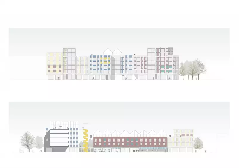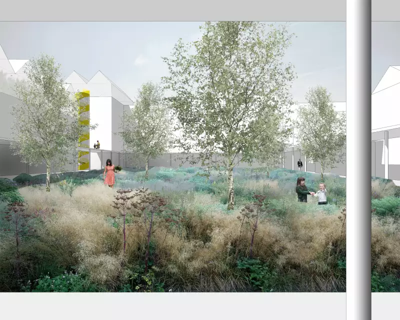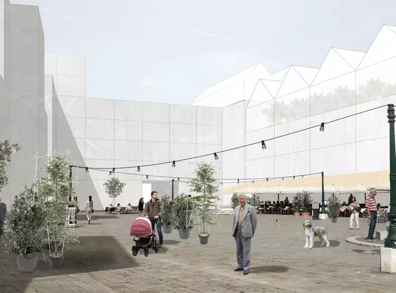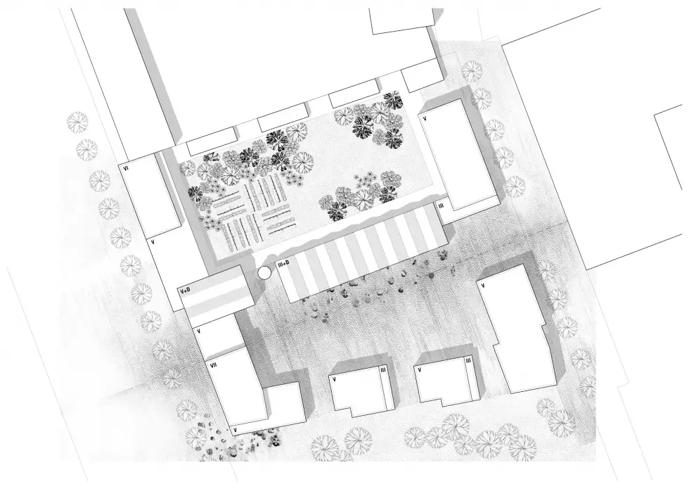 In the south, a lively piazetta is created by defining the public passageway. Common cooking and eating, brewing and drinking, roasting, tinkering, repairing, programming, selling and buying define the space. To the north, the enclosed garden courtyard with its surrounding pergola is reminiscent of a "hortus conculusus". As a place of rest, of production, of slowness, of becoming and growing, it is a garden space for all. Wilderness and order are negotiated: Tree, flower and beet come equally into their own. In between, on the roof of the market hall building, there is an orangery, a collective winter garden.