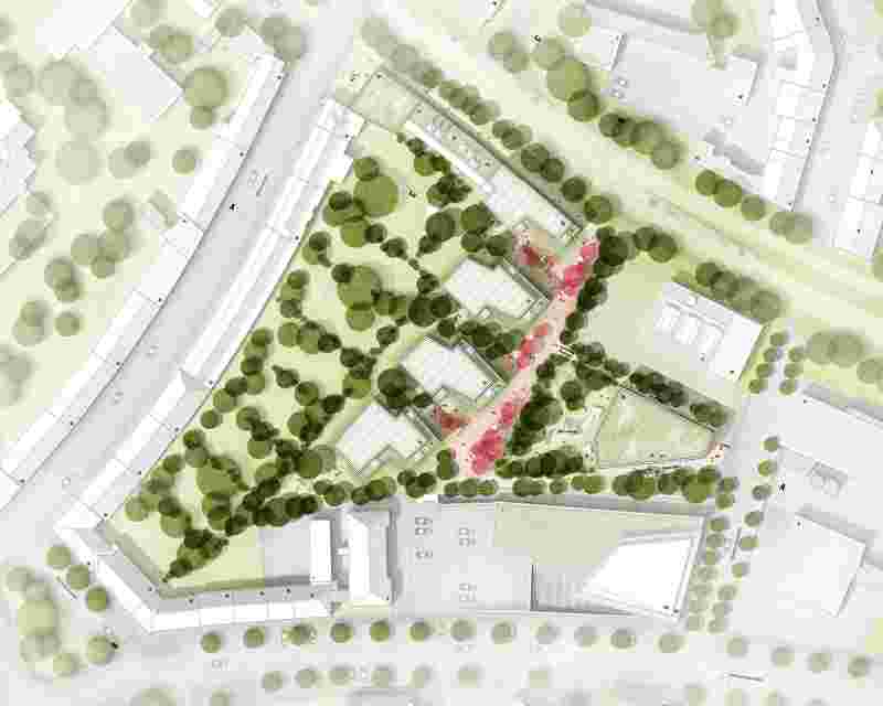 The PLAN is a response to this perception. The existing neighbourhood is being rounded off. A consistent description of the garden, which is entered from the south and opens up widely for residents, nursery children and staff, offering an attractive spatial impression. At the top, on Weberstraße, a new address is being determined. A six-storey building forms a landmark for the neighbourhood, marking the bridge over the railway and the transition to the hospital district. The building also creates a new address for potential residential and work spaces, as well as an entrance to the apartments in the north-east, which all open onto the garden to the south. These can be conceived either as maisonettes with an exterior street or as a classic pergola with several smaller units.