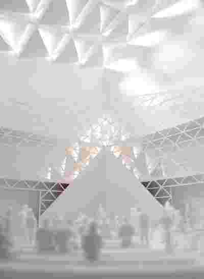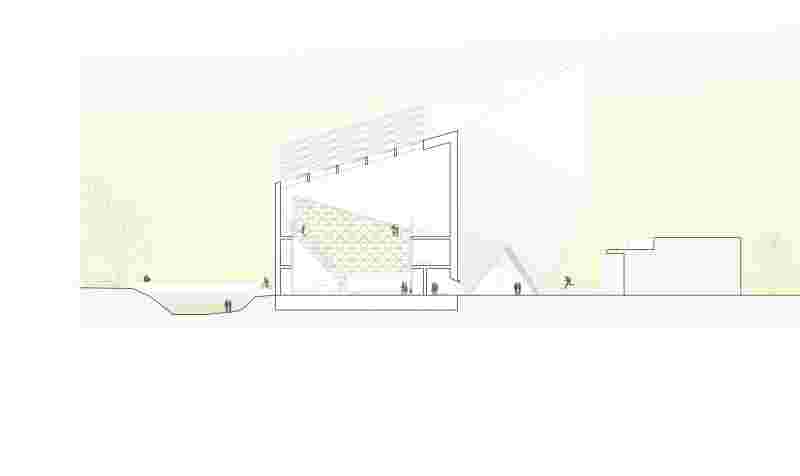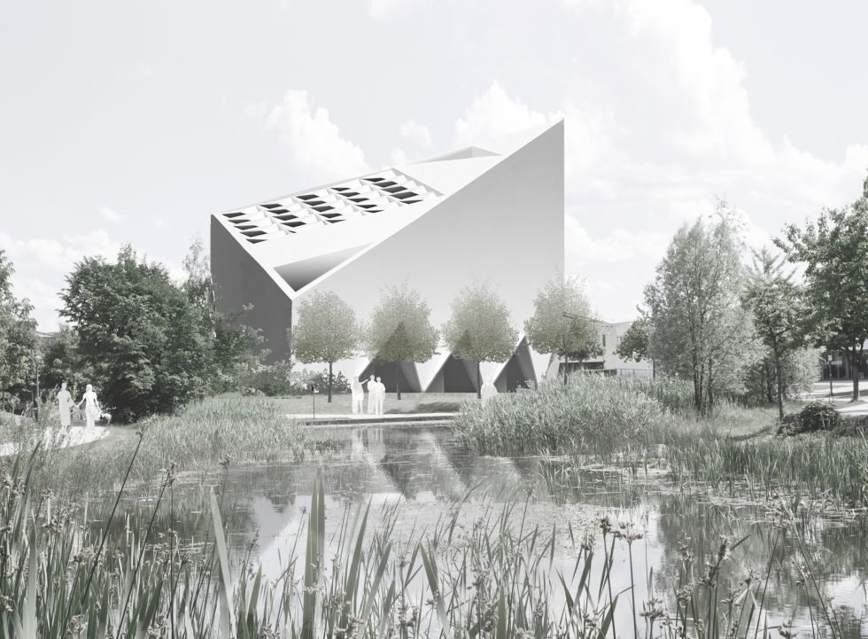 Der Baukörper fasst mit seiner ansteigenden Fassade und den plastisch hervortretenden Eingangsöffnungen, den Portalen, den Kirchenplatz und öffnet sich der Gemeinde. Die Entscheidung die Kirche als ein Haus zu bauen, in welchem das Pfarrhaus untergebracht ist begründet sich zum einen durch den Wunsch einen großzügigen Kirchenplatz für die Gemeinde zu schaffen, welcher den räumlichen Abschluss des Landschaftsraums herstellt und der Gemeinde als Platz und Ort der Erholung dient. Die Kirche soll ein deutlich erkennbarer städtebaulicher Schwerpunkt in der Siedlungserweiterung von Poing sein und der Gemeinde mit Ihrem hohen Wiedererkennungswert Identität stiften.