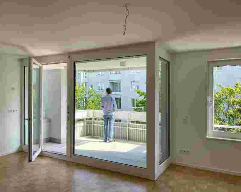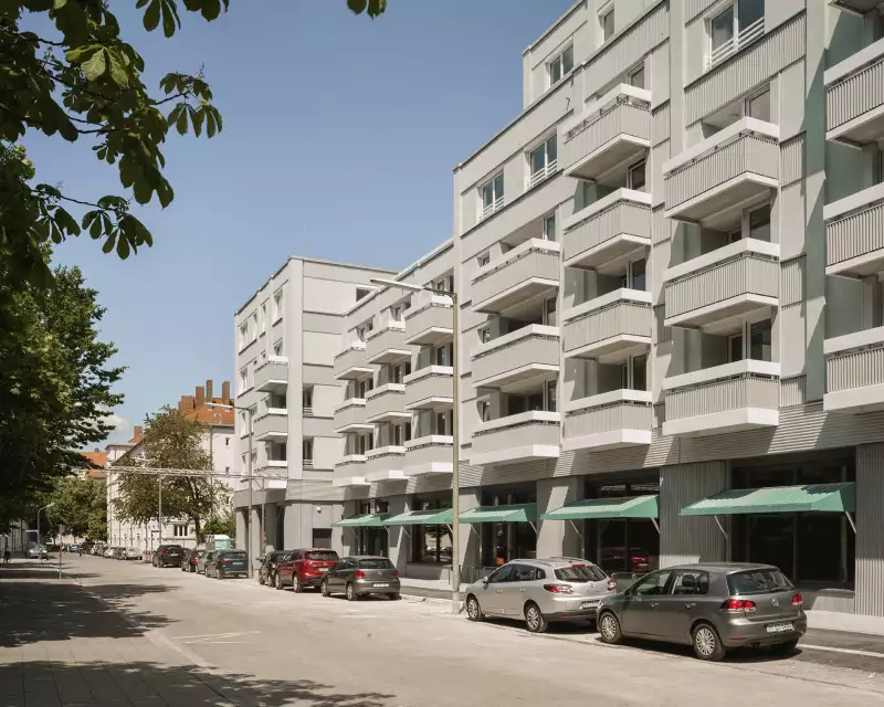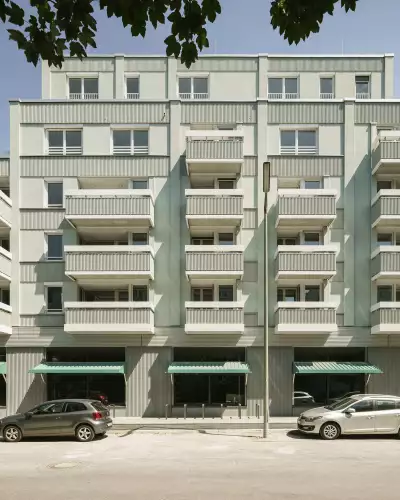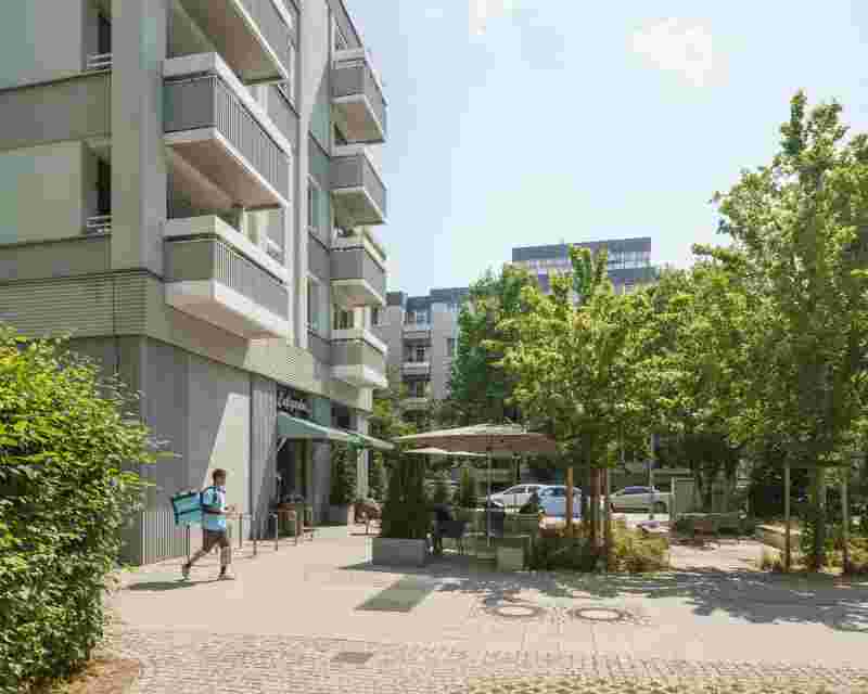 On the ground floor/basement there is a supermarket and on the six upper floors there are 42 very different flats, ranging from flats to maisonettes. A common staircase provides access to the entire building; in addition, the flats in the west are connected via an arcade. Roof terraces are located on the roofs and some of the maisonettes have spacious two-storey rooms. The living quality of all flats is very high. Overall, there is a wide range of flats from small flats to large family flats. Since the builder is also the owner of the property, all flats are rented out.