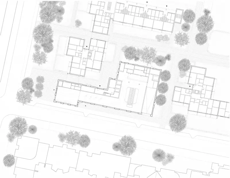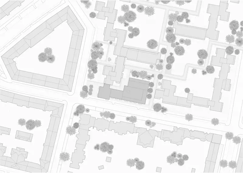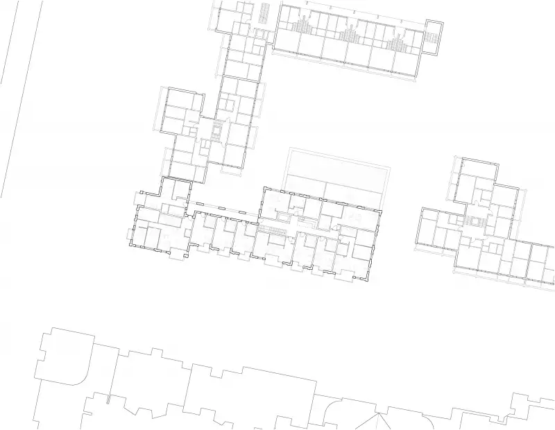 With the east/west oriented high point on Zaubzerstrasse, the existing typology of space-creating crossbars projecting into the inner courtyard is taken up. By staggering the upper storey, the structure adheres to the usual storey structure in the street. The new building mediates between the two worlds of the block and the dissolved development of the estate. The result is differentiated open spaces that respond to the respective use and context.