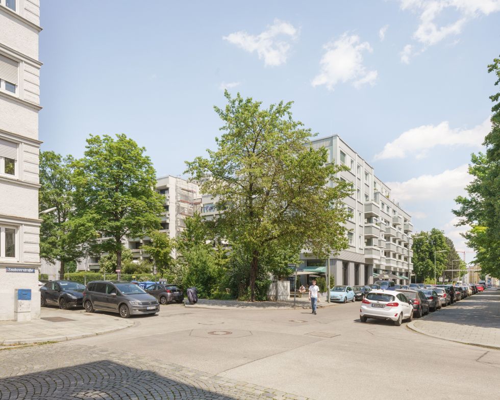 The design leaves a space at the street corner, builds on the recessed existing building with a five-storey body and continues upwards over four and five storeys respectively to a seven-storey high point along Zaubzerstrasse.