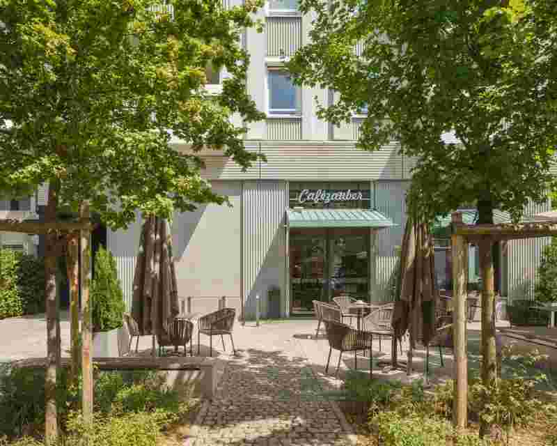 Instead of the existing car park (corner of Zaubzerstrasse and Stuckstrasse), a small square is created with a public terrace for the café. The supermarket faces south towards Zaubzerstrasse and is also entered from there. A café/bakery shop is located at the square. Access to the flats is located inside the neighbourhood, independent of the supermarket. The access to the apartments follows the logic of the entire complex, which is always accessed from the inside along the passageways.