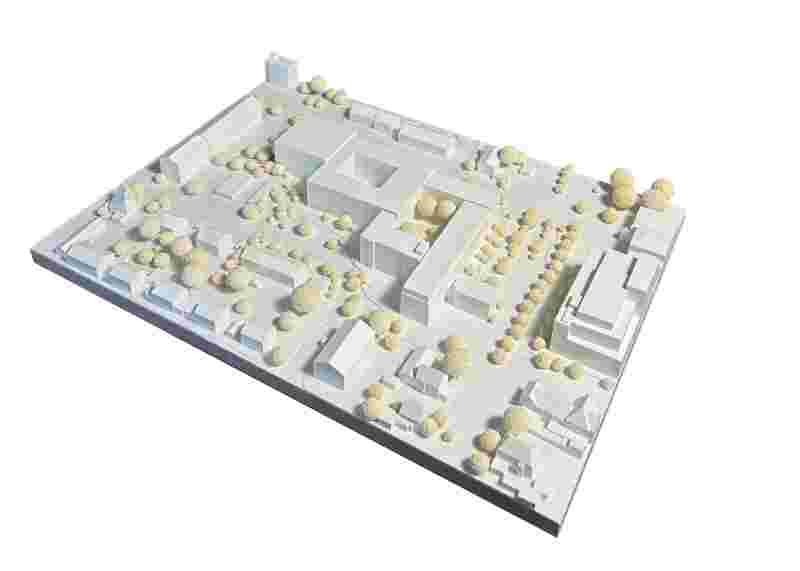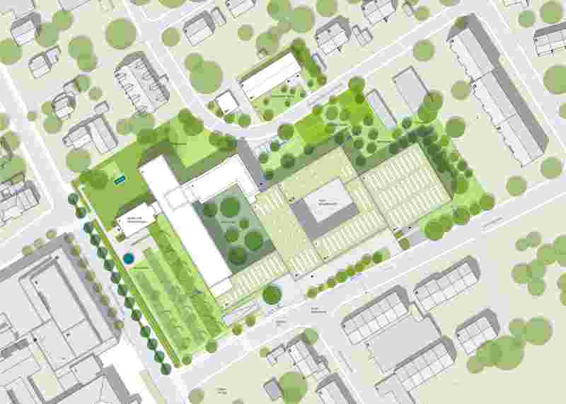 Als schnell wachsende Stadt mit regional und überregional wirksamen Angeboten an Arbeit, Bildung, Gesundheit und eben Verwaltung, erscheint es logisch den Ort der Landkreisverwaltung zu zentrieren und nachhaltig zu erweitern. Die Umgebung des bestehenden Landratsamtes ist dabei stark heterogen geprägt. Sowohl Nachbarschaften von unterschiedlichen Maßstäben, das Klinikum neben den Einfamilienhäusern, wie auch damit verknüpft eine abwechslungsreiche Nutzungsstruktur. Dienstleister und Verwaltung neben Gesundheit, Schulen und kleinteiligem Wohnen. Durch die durchgehend siedlungsartige Bauweise stellt sich ein relativ offener Raumeindruck ein. Straßenläufe werden von Baumreihen und mächtigen Einzelbäumen begleitet und Gärten öffnen sich räumlich zur Umgebung. Der Eindruck einer stark durchgrünten Nachbarschaft ist die Folge. Ein wesentlicher Maßstabssprung ist durch den geplanten Ausbau des Klinikums zu erwarten. Die schiere Masse schafft im Quartier eine neue Dimension. Dem neuen Landratsamt kommt dabei die Rolle eines Vermittlers im Bezug auf Maßstab und verständlicher Atmosphäre, als neues Bauwerk, das Struktur sein muss aber als Haus lesbar bleiben soll, zu.