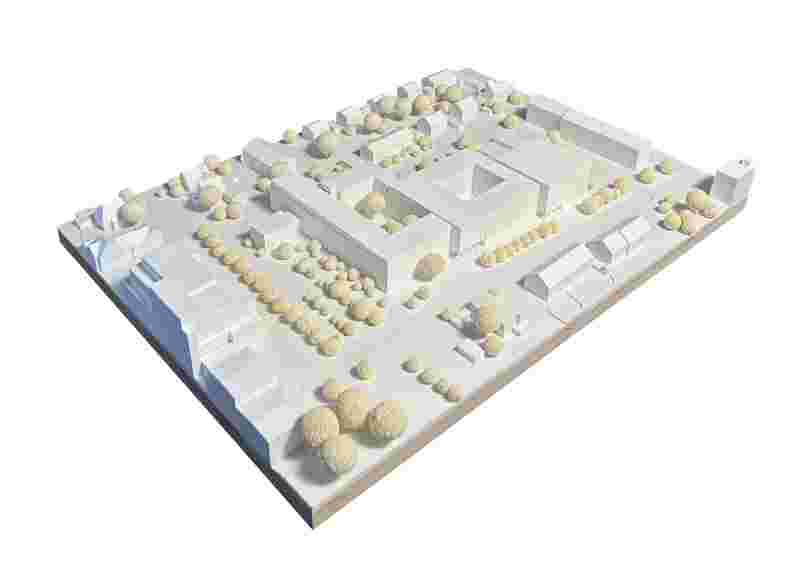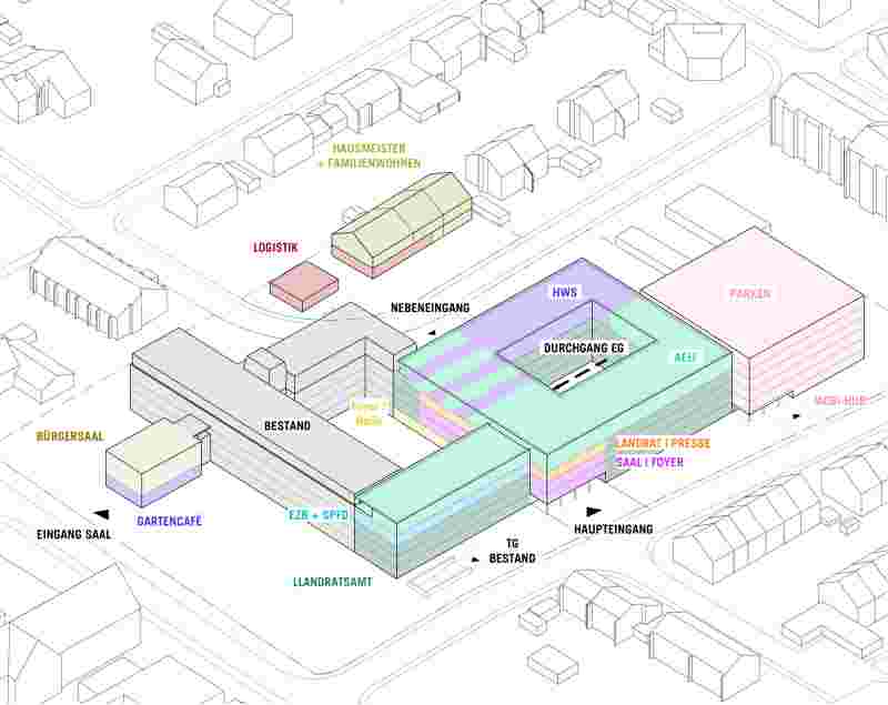 Der Bestand des Landratsamtes zeigt sich als ein Gefüge von unterschiedlichen Bausteinen und Erweiterungen, die aber am Grundsatz des fünfgeschossigen Bauteils mit leicht variierender Traufe festhalten. Ziel des Entwurfs ist es, eine in diesem Sinne ruhige und in Bauteilen fortzuschreibende Struktur zu entwickeln, die auch in Teilen räumlich und architektonisch überzeugen kann. Der Entwurf versteht sich als ein wachsendes, klar organisiertes, wirtschaftlich mit lokalen Baustoffen und Handwerkern nachhaltig erstellbares Haus. Die Architektur eines Landratsamtes muss mit dem Ort, aber vor allem auch mit der Region klar erkennbar verknüpft sein.