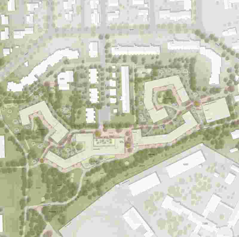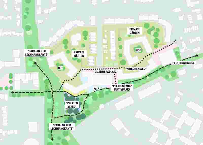 Um dieses Ziel zu erreichen, gliedert sich die Entwurfsaufgabe für die Freianlagen in drei Ebenen: Ein Park entlang der Lechhangkante für alle Landsberger, eine Adressbildung und inklusive Treffpunkten - Höfe, Gärten und Plätze für alle Bewohner, sowie ein Erhalt und eine Ergänzung der bestehenden natürlichen Bereiche für Flora und Fauna.