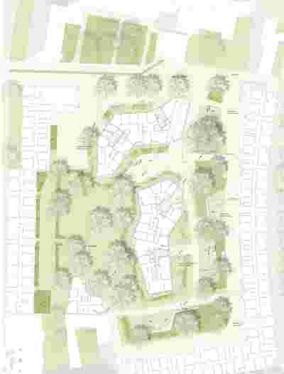 Das großzügige Hofensemble des Wettbewerbsgebietes hat eine ganz besondere Qualität. Die im Norden liegende Kirche St. Gabriel und der prächtige Baumbestand schaffen eine einzigartige Atmosphäre. Das Projekt macht es zu seiner Hauptaufgabe den Charakter des Hofes zu stärken und sowohl die neuen, als auch die bestehenden Wohngebäude davon profitieren zu lassen. Mit der neu entstehenden höheren Dichte soll weiterhin für alle Bewohner das Besondere des Ortes erfahrbar bleiben. Eine Zielsetzung des Entwurfes ist es, den wertvollen Baumbestand fast gänzlich zu erhalten.