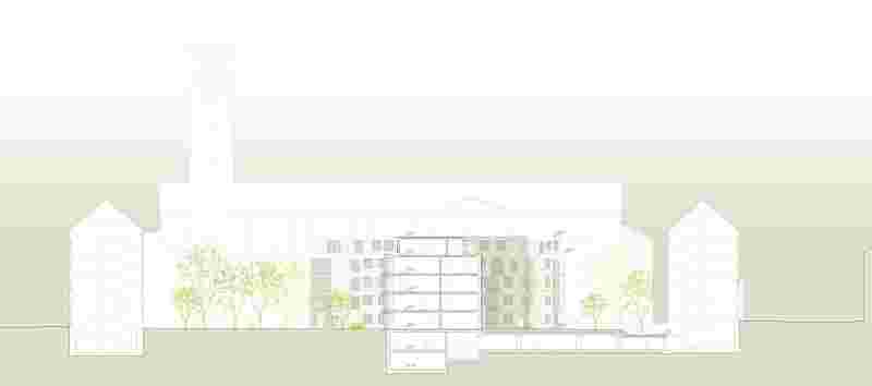 Die Gestaltung der Fassaden wird aus den umgebenden Gebäuden entwickelt. Die hellgeschlämmten Mauerwerksfassaden der Neubauten sind farblich an die bestehenden Wohngebäude angelehnt und in ihrer Struktur und Materialität an die Klinker der Kirche.