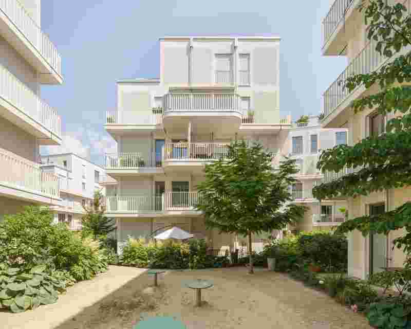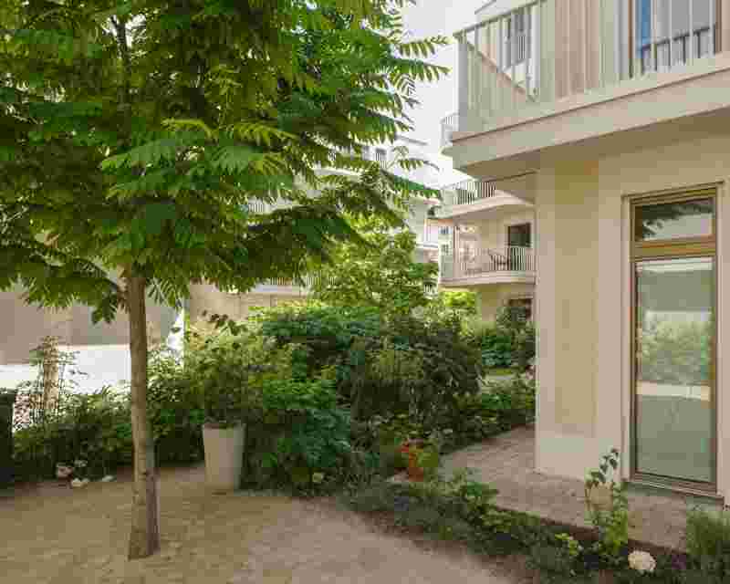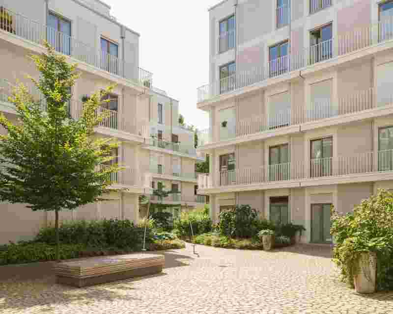 Die Gebäude werden als Massivbauten in Stahlbeton mit einem verputzten, glatt gefilzten Wärmedämmverbundsystem ausgeführt. Die Gestaltung der Fassaden referenziert dabei auf die leichte Eleganz der charakteristischen Häuser der 1950er Jahre in der Maxvorstadt. Die neuen Gebäude verfügen über ein hohes Maß an Individualität und sind als einzelne Bausteine erkennbar. Die einzelnen Wohnungen sind variabel in Größe und Grundriss und bieten durch die Schaffung verschiedener Typologien eine flexible und lebendige Mischung im Gefüge.
