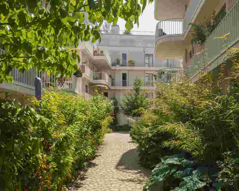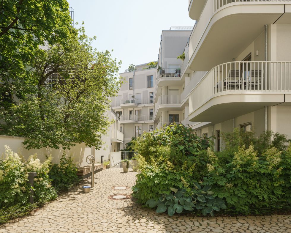 Die knapp vor den Gebäuden verlaufenden durchgängigen Balkone geben den Wohnungen einen individuellen Freiraum, an den Loggien verbreitern sich diese sonst schmalen Bänder zu großzügigen grünen Zimmern.