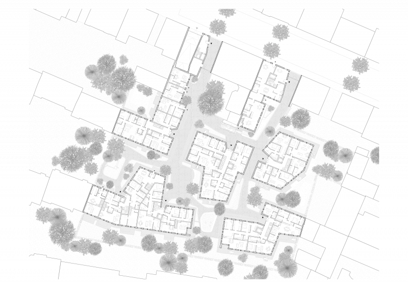 Das Bedürfnis nach ruhiger und ungestörter Privatheit steht im Gegensatz zum gemeinschaftlichen Wohnen im Städtischen Umfeld, dies ambivalente Gleichgewicht herzustellen ist die Aufgabe des Projektes. In den sehr verdichteten Räume wird ein sinnvolle Verteilung von Privatheit und Öffentlichkeit hergestellt, differenziert gestaltete Freiräume bieten unterschiedliche Aufenthaltsqualitäten, die Lage der Zugänge sowie wechselnde Orientierungen der Wohnungen sichern die Privatheit.